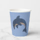 These paper cups have a sparkle like dolphin who is dark blue with a white belly in a jumping position on the front and back on a light blue background.