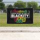This outdoor banner features a colourful message in red, yellow, green, and white typography that reads "Juneteenth, I'm black every day, but today I'm blackity black black black black," and is a great way for anyone to show support for African Americans and commemorate Emancipation Day on June 19, 1865.