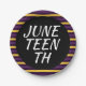 Juneteenth celebration holiday paper plates with a border of purple and yellow stripes. They have a black background in the centre with the text in white.