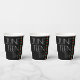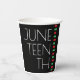 Juneteenth celebration paper cups. They have a design including a black background, a red, black, and green stripe, and the letters are in white.