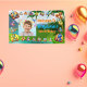 Welcome to a prehistoric party with this vibrant Jungle Baby Dino Kids Birthday Party Banner! Centred prominently is a joyful photo of the birthday child, framed by a colourful jungle scene filled with adorable baby dinosaurs. Friendly faces like a playful T-Rex, a curious Triceratops, and a gentle Brontosaurus peek out from behind lush green leaves and vibrant tropical flowers, creating an inviting atmosphere.