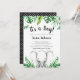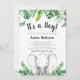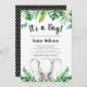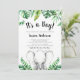 Adorable boy elephant baby shower invitation design featuring watercolor tropical leaves, baby elephant and black polka dot pattern.