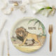 Birthday party plates for a boy or girl featuring a lion stalking in the jungle and personalised text to add their name and event title.
