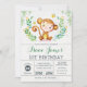 Birthday invitation featuring an adorable watercolor monkey surrounded with green ferns and foliage