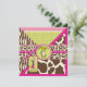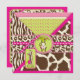 Safari prints, giraffe, zebra, and cheetah and a polka dot pattern, with monkey hanging on a vine and 3D look tags, bows, trims first birthday invitation card.