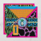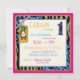 Safari prints, giraffe, zebra, and cheetah and a polka dot pattern, with monkey hanging on a vine and 3D look tags, bows, trims first birthday invitation card.