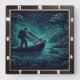 This is a stylised illustration depicting a lone adventurer in a narrow boat, poling their way down a jungle river. The artwork is rendered in shades of deep blue and vibrant teal, giving it a mystical, nocturnal feel. Lush tropical foliage, distant mountains, and an overhead bird are all depicted with an embossed or woodcut-like texture. Several fish are visible in the glowing water near the boat.