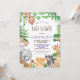 Invite friends and family to celebrate your baby shower with this sweet and charming jungle safari animal baby shower invitation. This design features cute baby animals such as an elephant, zebra, giraffe, monkey, and a lion surrounded by botanical leafing. On the back of the card, there's a Books for Baby request. Customise the text with the font and colour of your choice or leave this popular typography for your convenience. Other colours and styles are available. Just contact us and we'd be glad to assist you in making your party perfect!