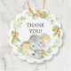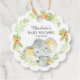 Cute jungle animals baby shower favour tag featuring an elephant framed with jungle leaves & hibiscus flowers.