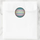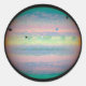 Two of the moons were crossing Jupiter's face at the same time as the three shadows. Jupiter appears in pastel colours in this photo because the observation was taken in near-infrared light. Astronomers combined images taken in three near-infrared wavelengths to make this colour image. The photo shows sunlight reflected from Jupiter's clouds. In the near infrared, methane gas in Jupiter's atmosphere limits the penetration of sunlight, which causes clouds to appear in different colours depending on their altitude. Yellow colours indicate high clouds; red colours lower clouds; and blue colours even lower clouds in Jupiter's atmosphere. The green colour near the poles comes from a thin haze very high in the atmosphere. Ganymede's blue colour comes from the absorption of water ice on its surface at longer wavelengths. Io's white colour is from light reflected off bright sulphur compounds on the satellite's surface.