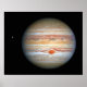 Image of Jupiter and the icy moon Europa, taken by the Hubble Space Telescope. Hubble’s sharp view is giving scientists an updated weather report on this huge planet’s turbulent atmosphere, including a new storm brewing, and a cousin of the Great Red Spot changing colour again.