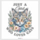 Cute watercolor grey brindle cat surrounded by pink and blue flowers.