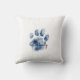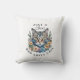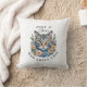 Cute watercolor grey brindle cat surrounded by pink and blue flowers. Back pillow has cat paw print with the name inside.