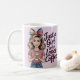 This mug displays a digital illustration of a young woman with wavy shoulder-length hair and a large multicolored striped bow in her hair. She is wearing a rose-colored t-shirt and blue jeans, holding a white disposable coffee cup with both hands. Her expression is cheerful with a bright smile. The background is a solid lavender color. On the right side of the image, there is stylized text in purple that reads Just a Girl who Loves Coffee in script. The mug is a classic mug. The coffee mug is an eleven ounce mug. The mug is microwave and dishwasher safe.