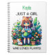 Cute, personalised notebook art for any girl who loves plants. Cute ai graphic in a 8-bit pixel video game style. Girl holding a watering can surrounded by lots of plants.