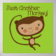 A cute brown monkey with a very long tail and brown text that reads Just Another Monkey on monkey T-shirts, mugs, bags, cards, pillows, stickers, magnets, keepsakes, wall clocks, and other items for kids and adults.