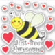 Just Be Awesome Slogan with a Yellow Bumble Bee. Bee Lovers Design. Cute Bumble Bee Cartoon Smile with Hearts and Swirls. Inspirational and Motivational Quote. With individual red hearts.