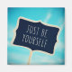 a chalkboard with the text just be yourself written in it against the blue sky, slight vignette added | Bigstock® - All Rights Reserved.