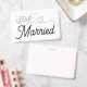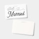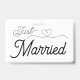 Just Married—fun newlywed badge for bride and groom. Elegant script font with a cute heart illustration. Simple and sweet black lettering.