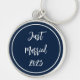 Keychain is shown in a striking navy blue with white combination, a classic keepsake for the couple.