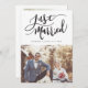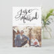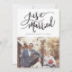 Modern wedding announcement template card featuring a hand lettered typography text that says "Just Married" with your name and wedding date. Customise this product by adding two pictures. One of the photo will go on the back of the card with your wedding and thank you message.