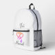 This backpack features a "Just Married!" design with a continuous line drawing of two rainbow swirly hearts (with shadow) linked together.