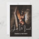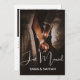Modern and elegant wedding announcement template card featuring a white hand lettered typography overlay text with swirls that says "Just Married" with your names. Customise this product by adding two pictures. One of the photo will go on the back of the card with your wedding and thank you message.