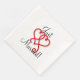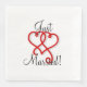 This paper napkin features linked swirly red hearts with the text "Just Married" in a black scripted font.