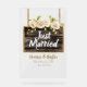 Acrylic wedding sign of a dark wood with Just Married with a row of white Roses.