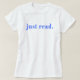 Just Read words in blue lettering in a minimalist Style. A perfect gift for a book lover, or for anyone who likes reading.