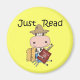 Just Read T-shirts, hoodies, mugs, cards, stickers, buttons, magnets, mousepads, journals, keepsakes, and other reading theme apparel and gifts that promote reading in a cute way! A cow with a straw hat and pitchfork rests against a hay bale with a book!