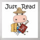 Just Read T-shirts, hoodies, mugs, cards, stickers, buttons, magnets, mousepads, journals, keepsakes, and other reading theme apparel and gifts that promote reading in a cute way! A cow with a straw hat and pitchfork rests against a hay bale with a book!
