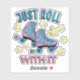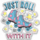 Retro style illustration with "Just Roll With It" text design and colourful stars and roller skate decoration
