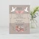 A beautiful invitation featuring bold, tan and taupe background stripes which are overlaid with a cluster of roses and abstract swirls. Above them are two doves holding a draped banner. The doves and banner, as well as the leaf divider, can be dragged to any location, made larger or smaller (+-) or eliminated. (VTZ)
