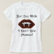 Just Say Hello is an image of deep maroon lips with protruding fangs with additional text that says I Don't Bite Promise.