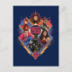 This diamond hatch design features the members of the Justice League in the panels surrounding the Justice League logo. Check out Aquaman in his trident themed panel, Cyborg and The Flash in digital themed panels, and Superman, Batman, and Wonder Woman in bold coloured panels. This graphic is framed with electronic circuits and lightning bolts, and the Justice League JL shield logo is positioned at the bottom centre.