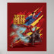 This high tech badge features Justice League's Superman, The Flash, and Batman rushing off to the right with a golden Justice League logo in the upper left. Red and gold futuristic panels are placed behind and around our heroes, while The Flash is forefront running at an incredible speed that generates electricity around his body.
