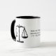 The Scales of Justice on a coffee, tea mug in black for an attorney, judge, paralegal, court stenographer, anyone in the justice department or a person that works towards justice or to give as a gift to clients with your contact information on