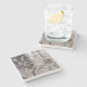 The coasters are gorgeous, a quality feel and heavy weight. They look like a precious archeological find. A rustic stone juxtaposed with a modern floral black and white print. I like the way the print goes slightly imperfect on the cut stone edges giving them a kind-of natural beauty.