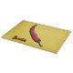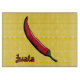 A red jwala chilli pepper, also known as an Indian hot finger pepper, is decorated with patterns inspired by Indian mehndi and sits on a yellow background with a smaller version of the same pattern and a script label in the corner. This moderately spicy pepper is used to add heat to authentic curries and other Indian cuisine.