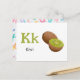 "Letter K is for Kiwi" in our Alphabet Flash Card set. Get all 26 letters of the alphabet! A double-sided postcard that is great for memory games and teaching, geared for education, schools, teachers and homeschoolers for kindergarten and babies. All text is editable if you need to customise.