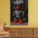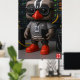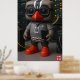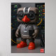 This image is of a stylised, Yanbaru bird-like figurine. It's dressed in an outfit that suggests a tech-savvy character, with a grey polo shirt, black shorts with a wavy pattern on the hem, and bright red shoes. The figurine has thick, black-rimmed glasses and a black and white striped pattern on the top of its head, resembling a hairstyle. It's holding a black tablet in its left hand and wearing a lanyard with a badge around its neck.