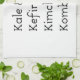 Kale, kefir, kimchi and kombucha text. Original text design.