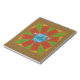 This artwork features a central light blue circle containing an intricate, radial pattern. Radiating from the centre are alternating wedge-shaped sections in vibrant oranges and greens, each embellished with detailed black motifs. These sections are framed by layers of sunny yellow and a decorative border of repeating blue circles and orange starbursts.