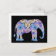 A beautifully patterned kaleidoscope elephant decorates this postcard. The elephant has marbled colours of turquoise, purple, gold, lavender, and white against a black background.