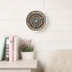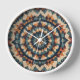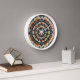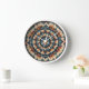 A vibrant geometric quilt pattern radiates from the centre, creating an intricate mandala design with various colours including shades of teal green, rust brown, and beige