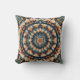 A vibrant geometric quilt pattern radiates from the centre, creating an intricate mandala design with various colours including shades of teal green, rust brown, and beige