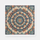 A vibrant geometric quilt pattern radiates from the centre, creating an intricate mandala design with various colours including shades of teal green, rust brown, and beige