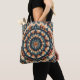 A vibrant geometric quilt pattern radiates from the centre, creating an intricate mandala design with various colours including shades of teal green, rust brown, and beige