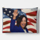 Portrait of the presidential candidate Kamala Harris with the stars and stripes and the wind behind her.